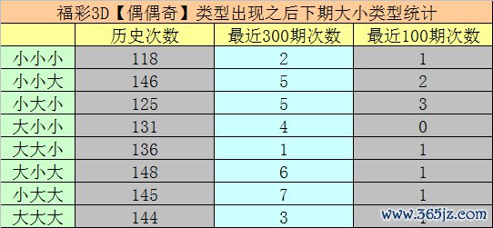 二、最近7次【大大大】奖号之后,其下期分辩开出号码:045、203、416、473、755、715、164,其中组三号码出现1次,组六号码出现6次。本期预测开出组六号码。