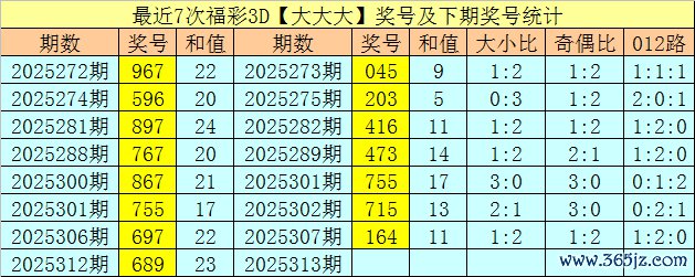 一、福彩3D上期奖号为689,大小类型开出:大大大,历史上该大小类型奖号共出现1094次,最近7次【大大大】奖号分辩开出:967、596、897、767、867、755、697,其中组三号码出现2次,组六号码出现5次。